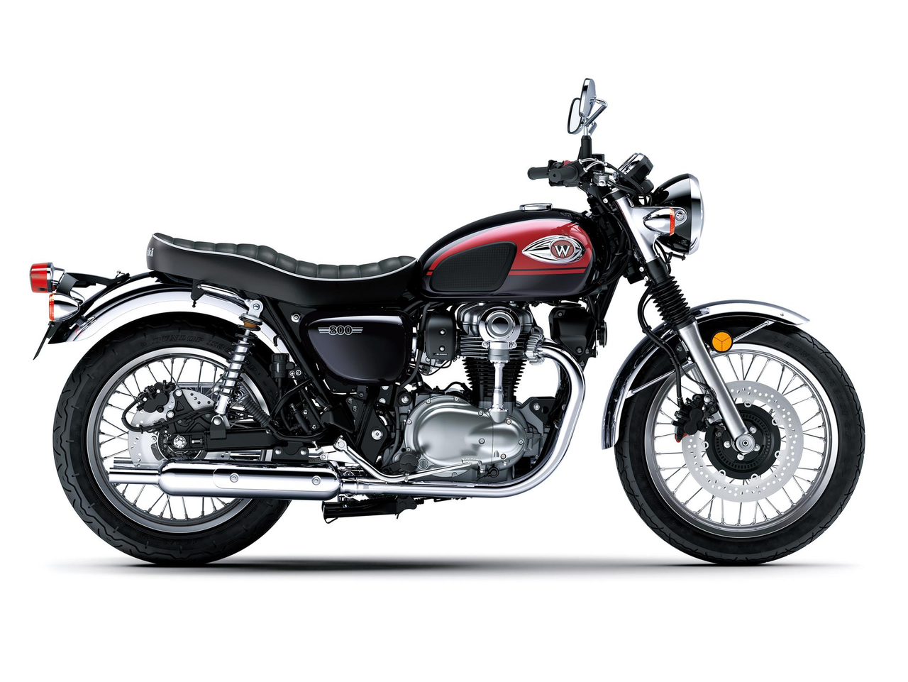 Přední kolo o průměru 19 palců a zadní kolo o průměru 18 palců dodávají modelu W800 klasické jízdní vlastnosti: dokonalou rovnováhu mezi uvolněným, lehkým zatáčením a stabilitou při jízdě v přímém směru. Zejména velké přední kolo přispívá k charakteristickému pocitu klidného řízení. Pro srovnání, kola o průměru 18 palců u modelů W800 STREET a CAFE poskytují o něco sportovnější jízdní vlastnosti.