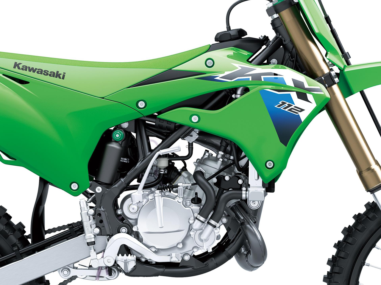Překonejte propast mezi malými a velkými motocykly s motokrosovým motocyklem KX112. Posouváme hranice s velkým dvoutaktním motorem o objemu 112 ccm v tomto supermini. Připravte svého začínajícího jezdce na přechod na velké motocykly díky vítězné kombinaci vyváženého výkonu, lehké ovladatelnosti a optimalizovaného podvozku.