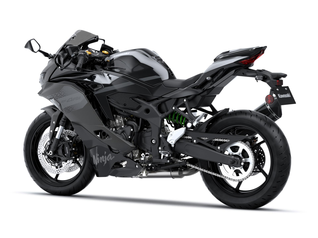 Invertovaná vidlice Ninja ZX-4R o průměru 37 mm využívá vnitřní součásti SFF-BP, které zajišťují výkon na závodní dráze i každodenní použitelnost, zatímco zadní odpružení Horizontal Back-link nabízí progresivní charakter. Přední vidlice modelů Ninja ZX-4R SE a ZX-4RR nabízí větší možnosti nastavení, včetně nastavitelného předpětí pružiny, a model Ninja ZX-4RR je vybaven zadním tlumičem Showa BFRC lite – stejným typem, jaký je použit u modelu Ninja ZX-10R.