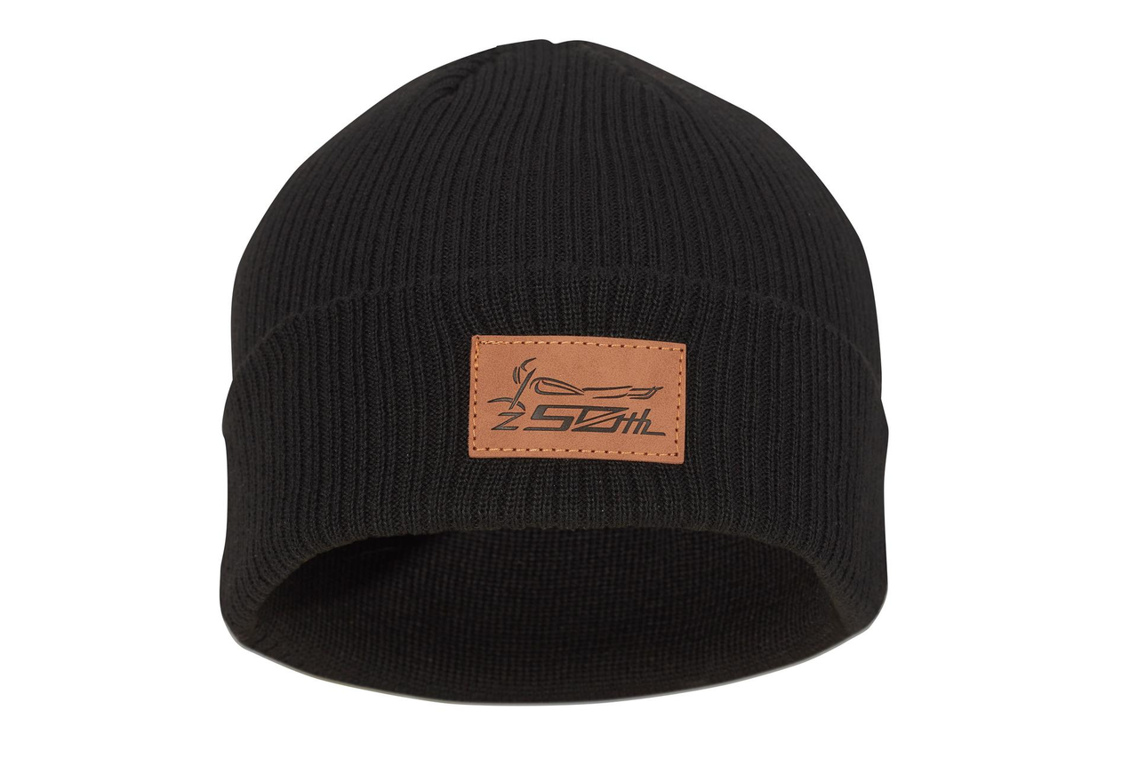 Čepice ze 100% bavlny s ohrnutým okrajem, který lze tvarovat podle libosti, s reliéfním logem 50. výročí na koženkové nášivce.