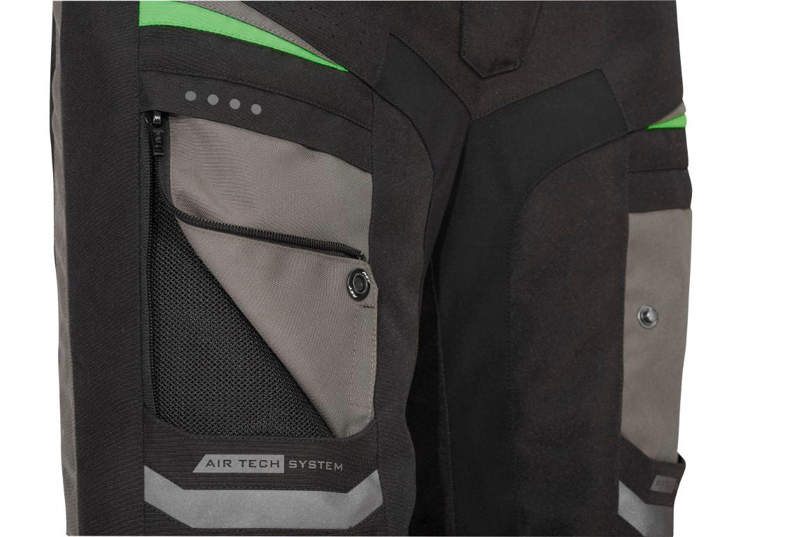 Mezi další podpůrné funkce patří zipy MAX, 360° spojovací zip pro připojení k textilní bundě TRIER a vícekapesové oblasti pro přívod a odvod vzduchu, které lze podle potřeby otevřít, aby se vzduch proudil dovnitř, kolem a ven z džín.