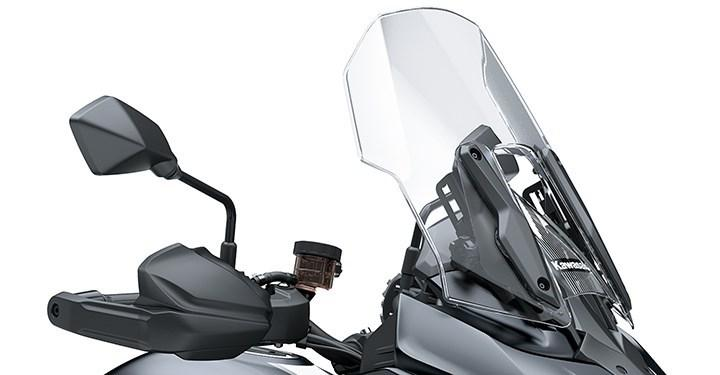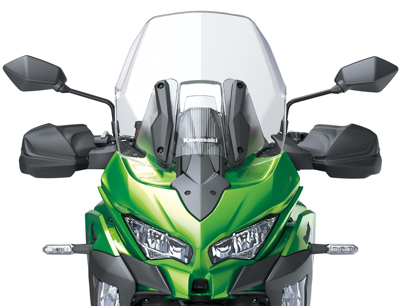 Čirý čelní štít odolný proti poškrábání, navržený pro větší pohodlí jezdce. Tento štít je přibližně o 90 mm vyšší a 140 mm širší než standardní štít. Produkt značky Kawasaki, vyrobený a vyvinutý společností Kawasaki a plně schválený pro provoz na silnicích.