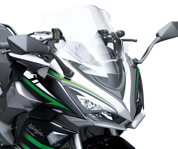 Velký čirý čelní štít odolný proti poškrábání, navržený pro větší pohodlí a styl jezdce. Produkt značky Kawasaki, vyvinutý společností Kawasaki a plně schválený pro provoz na silnicích.